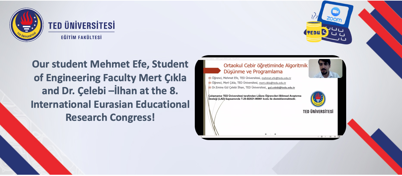 Students from the Elementary Mathematics Education program and from Engineering Faculty; Mehmet Efe and Mert Çıkla and Dr. E. Gül Çelebi-İlhan from the Department of Mathematics and Science Education Education attended the 8th International Eurasian Educational Research Congress between 7-10 July 2021. Mehmet Efe, Mert Çıkla and Dr. Çelebi-İlhan made a presentation on the “Algorithmic Thinking and Programming in Algebra at Middle School Mathematics”, which they carry out as a TEDU-LAD research project.